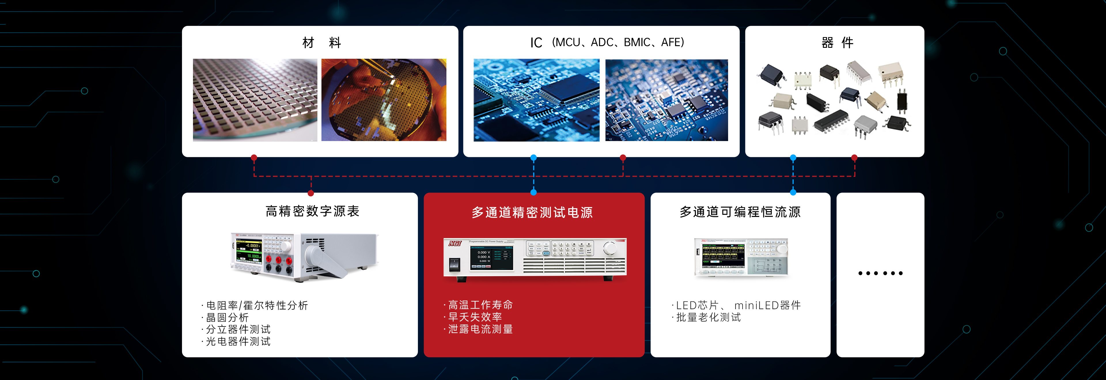 NGI覆蓋半導(dǎo)體行業(yè)全產(chǎn)業(yè)鏈,包括材料、器件、IC等。在綜合測試方面,NGI研發(fā)了首套國產(chǎn)高精密數(shù)字源表,針對集成電路芯片,NGI研發(fā)了高精度多通道的測試電源,滿足射頻、CPU、AFE等多類型芯片測試需求。