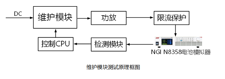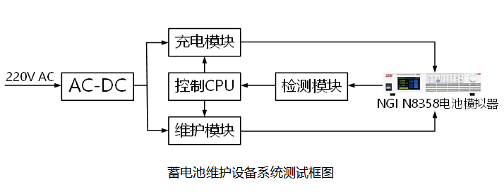 針對(duì)電池維護(hù)系統(tǒng)的充電模塊和維護(hù)模塊測(cè)試,N8358測(cè)試原理框圖如下:
