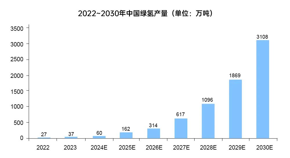 按照制取?式和碳排放量的不同,氫能一般分為灰氫、藍氫和綠氫三種。綠氫是一種利用風電、水電、光伏等可再生能源電解水制氫的方式,具有制氫純度高、無溫室氣體和有害氣體排放等優(yōu)勢。隨著可再生能源的快速發(fā)展、制氫設備成本的不斷下降,電解水制氫已成為未來制氫的主要發(fā)展方向。根據(jù)預測,2030年全球綠氫份額將從1%增長至34%,需求量將超過3000萬噸,年均復合增速高達81%。