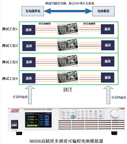 N8358單臺具備8通道,通道獨(dú)立控制,每個通道均可輸出或者吸入電流,在智能手機(jī)、藍(lán)牙耳機(jī)等消費(fèi)類電子產(chǎn)品ATE(AutomaticTestEquipment)測試系統(tǒng)中,單條產(chǎn)線常采用四工位拼版并行測試,在測試中使用四個通道作為電源,提供高精度穩(wěn)定電源輸出,剩余四個通道作為電池模擬器,兩兩配對模擬不同工況是否滿足內(nèi)建曲線要求。單臺便能快速搭建單產(chǎn)線四工位測試系統(tǒng),大大提高產(chǎn)品測試效率,節(jié)省客戶投資。